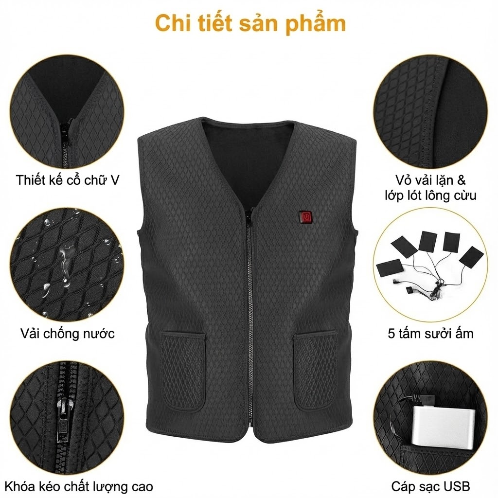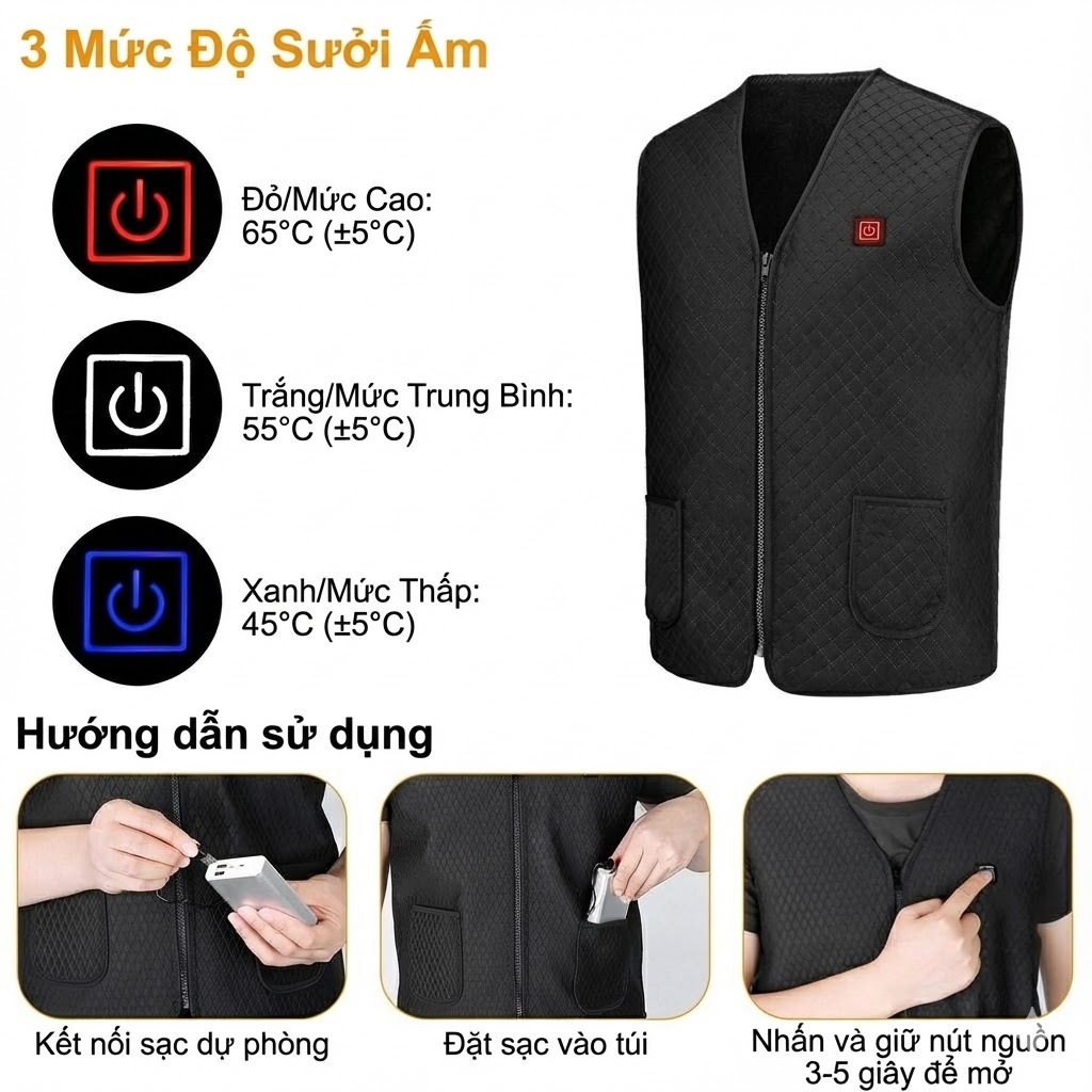 Áo Giữ Nhiệt Sưởi Ấm USB 5 Vùng là sự kết hợp hoàn hảo giữa thời trang và công nghệ. Nó mang lại sự ấm áp chủ động, an toàn và tiện lợi. Với mức giá hợp lý, đây là khoản đầu tư xứng đáng nhất cho sức khỏe trong mùa đông này.