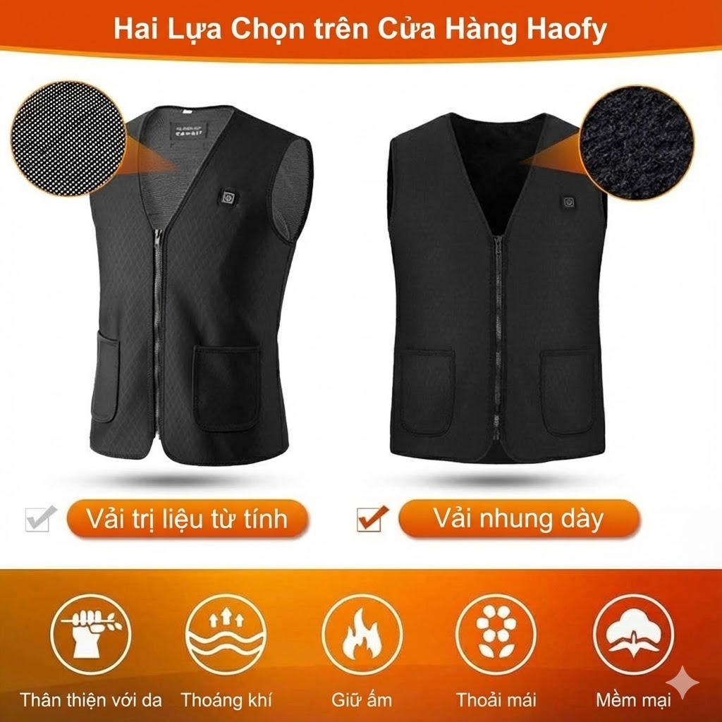 Về chất liệu, áo có hai phiên bản vải để bạn lựa chọn. Một là vải công nghệ từ tính (Magnetic therapy) giúp lưu thông khí huyết. Hai là vải nhung (Velvet) dày dặn, mềm mại. Cả hai đều nhẹ, thoáng khí và giữ nhiệt tốt ngay cả khi không bật điện.